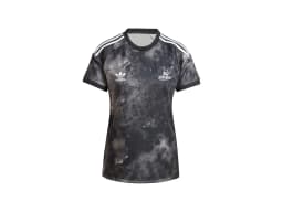Women's replica jersey from the adidas Originals x 100 Thieves collaboration, modelled on the team-issued kit worn by 100 Thieves' VCT and LCS rosters. Made from 100% polyester with a sublimated all-over print and boxy, oversized fit. Features a ribbed crewneck collar, embroidered 100T and adidas logos, high-texture Three Stripes on the sleeves, and heat-transferred sponsor logos. Lifestyle and esports-culture use.