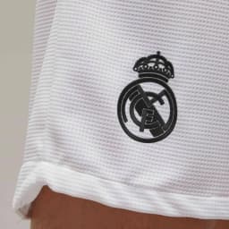 Men's pre-match shorts from the adidas Y-3 x Real Madrid 2024 collaborative matchwear collection. Made from 100% recycled polyester in white with a breathable ribbed waistband. Part of a broader set including a pre-match top and anthem jacket. Football/lifestyle use.