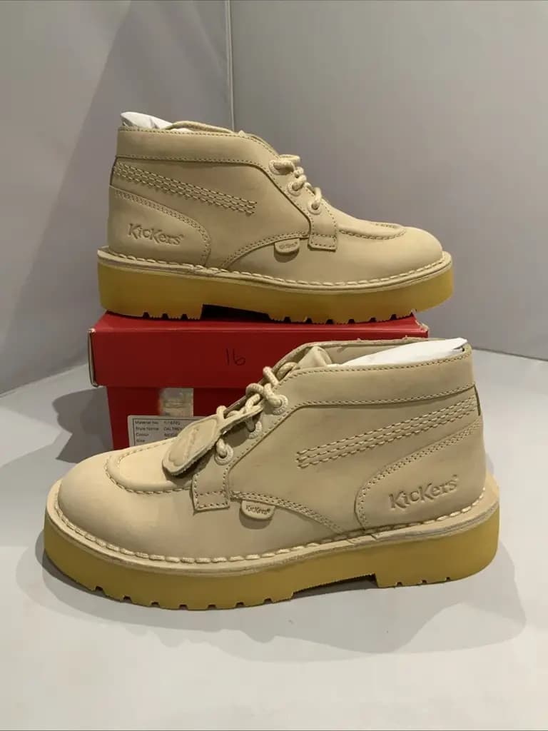 Unisex chukka boot from Kickers, Daltrey Chuck model in beige nubuck. Features a soft nubuck leather upper with Kickers' signature triple stitch, branded eyelets, and iconic fleurette detailing. Lace fastening with a 100% leather insole and rubber outsole. Classic casual lifestyle use.