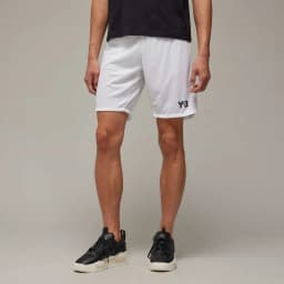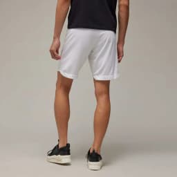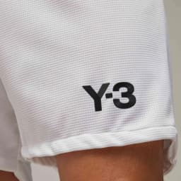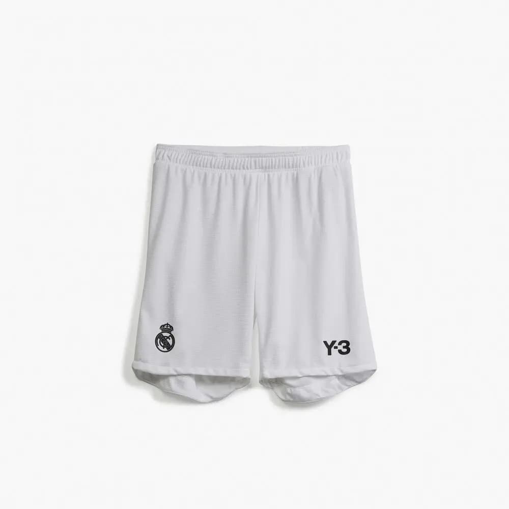 Men's pre-match shorts from the adidas Y-3 x Real Madrid 2024 collaborative matchwear collection. Made from 100% recycled polyester in white with a breathable ribbed waistband. Part of a broader set including a pre-match top and anthem jacket. Football/lifestyle use.
